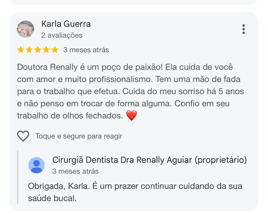 Dentista especialista em endodontia, a Dra. Renally é referência em odontologia por entregar excelência, atendimentos humanizados e um consultório moderno, preparado para te atender com conforto e segurança.